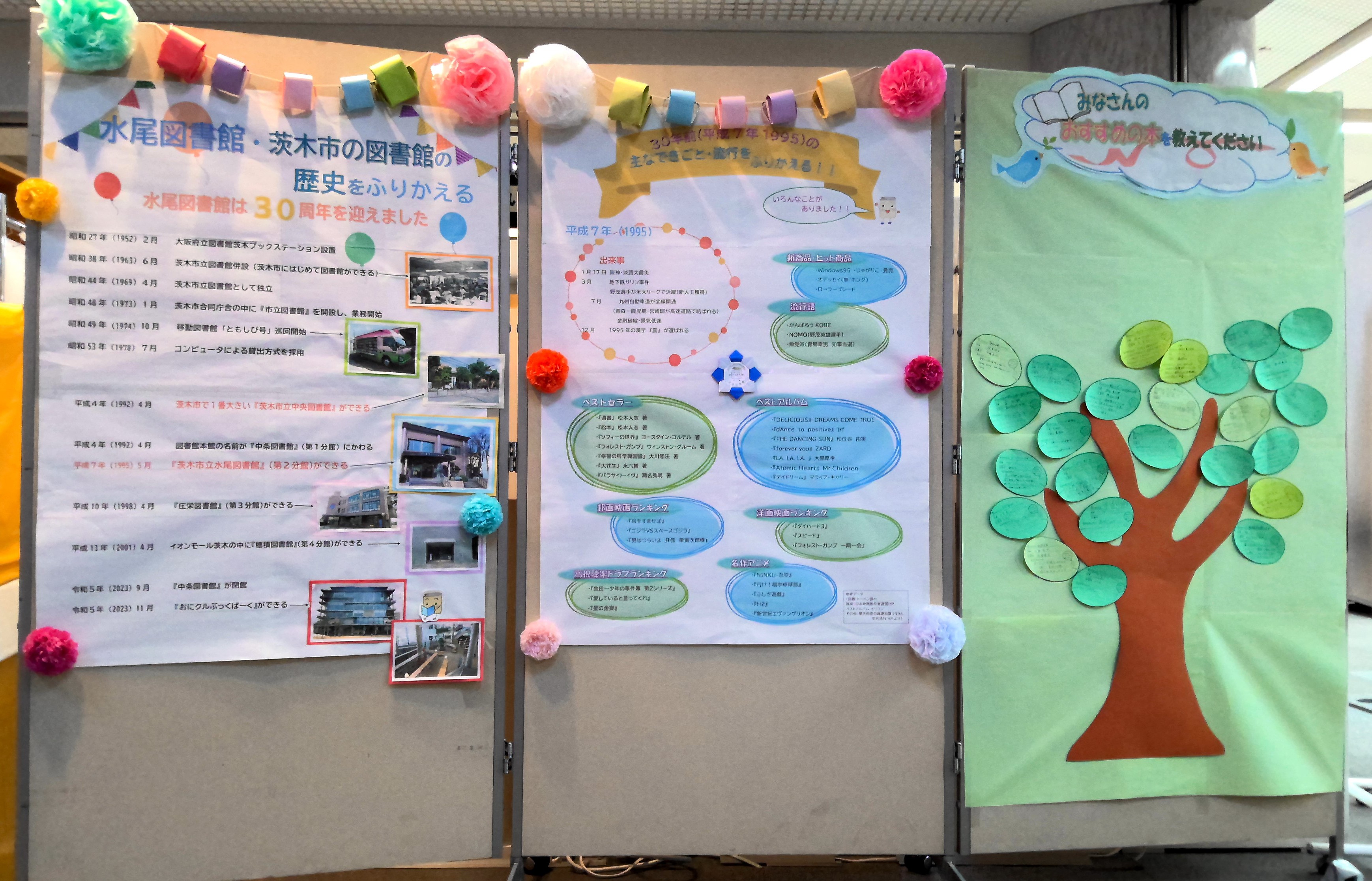水尾図書館30周年記念のパネル展示を行っています。みなさんのおすすめ本で作るブックツリーも開催していますので、ぜひおすすめ本を教えてください!